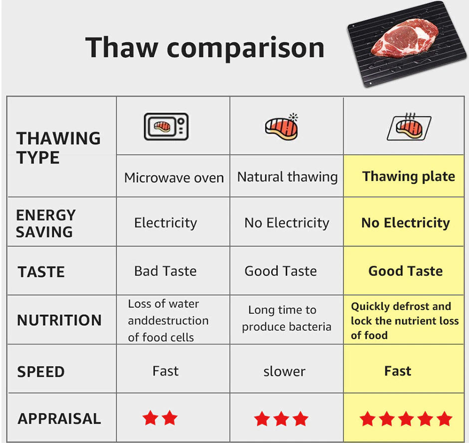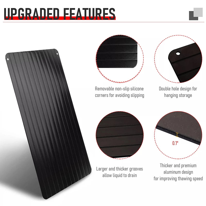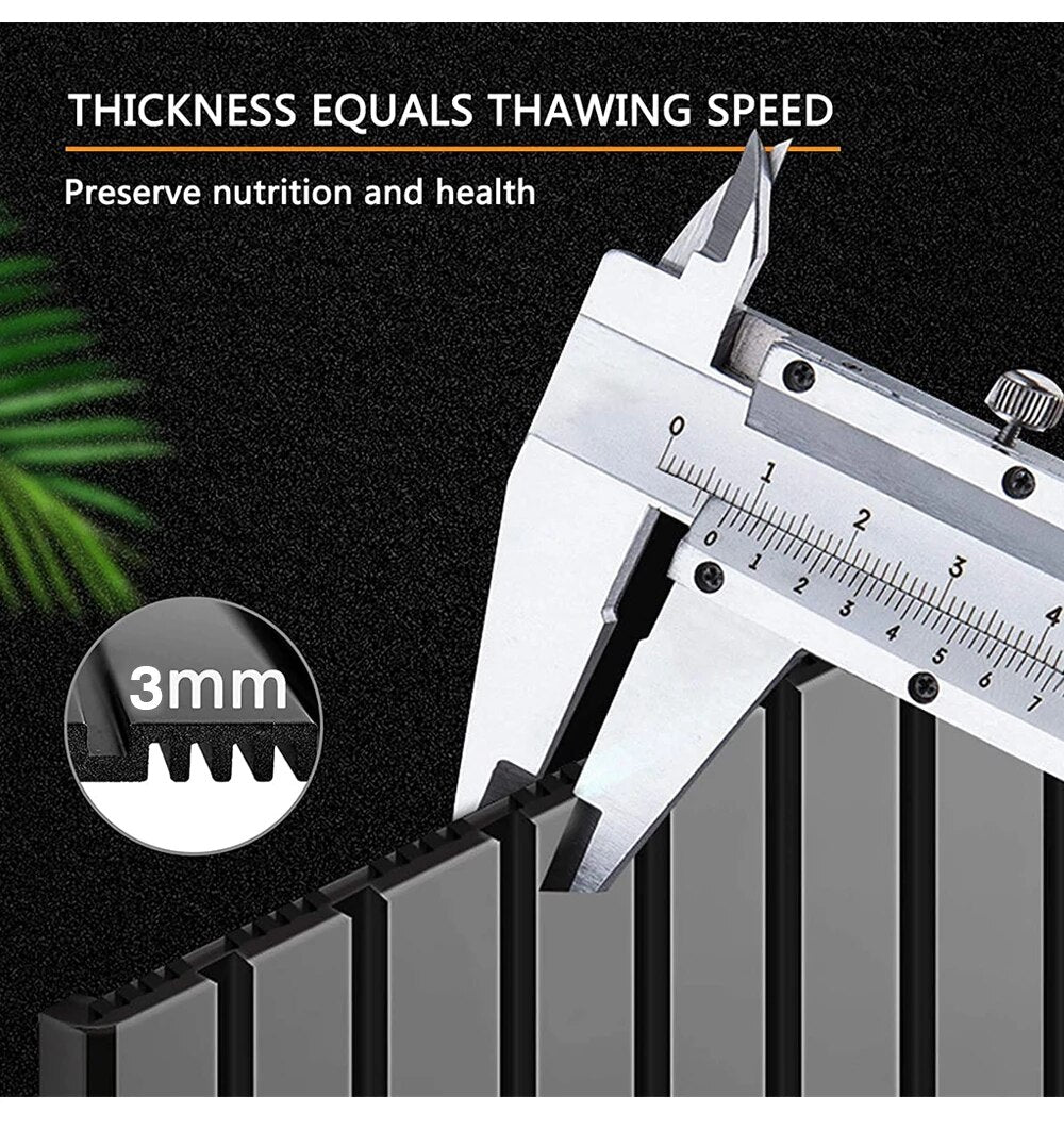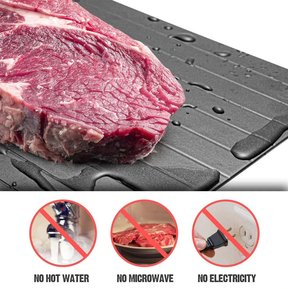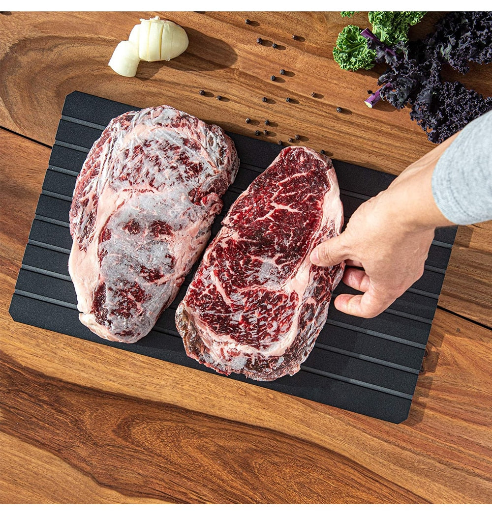 Le Plateau de Décongélation Rapide est fabriqué en aluminium conducteur thermique de qualité supérieure pour accélérer le processus de décongélation, la vitesse de décongélation est 8 fois plus rapide qu'à température ambiante. Plus besoin de vous demander comment décongeler vos aliments en quelques minutes ! Le Plateau de Décongélation Rapide Imperial Home vous permet de décongeler rapidement et naturellement votre viande ou vos aliments congelés. Vous n'avez pas besoin de passer votre viande congelée au micro-ondes pour la décongeler, il suffit de la placer sur le super plateau de décongélation et de voir la magie opérer.